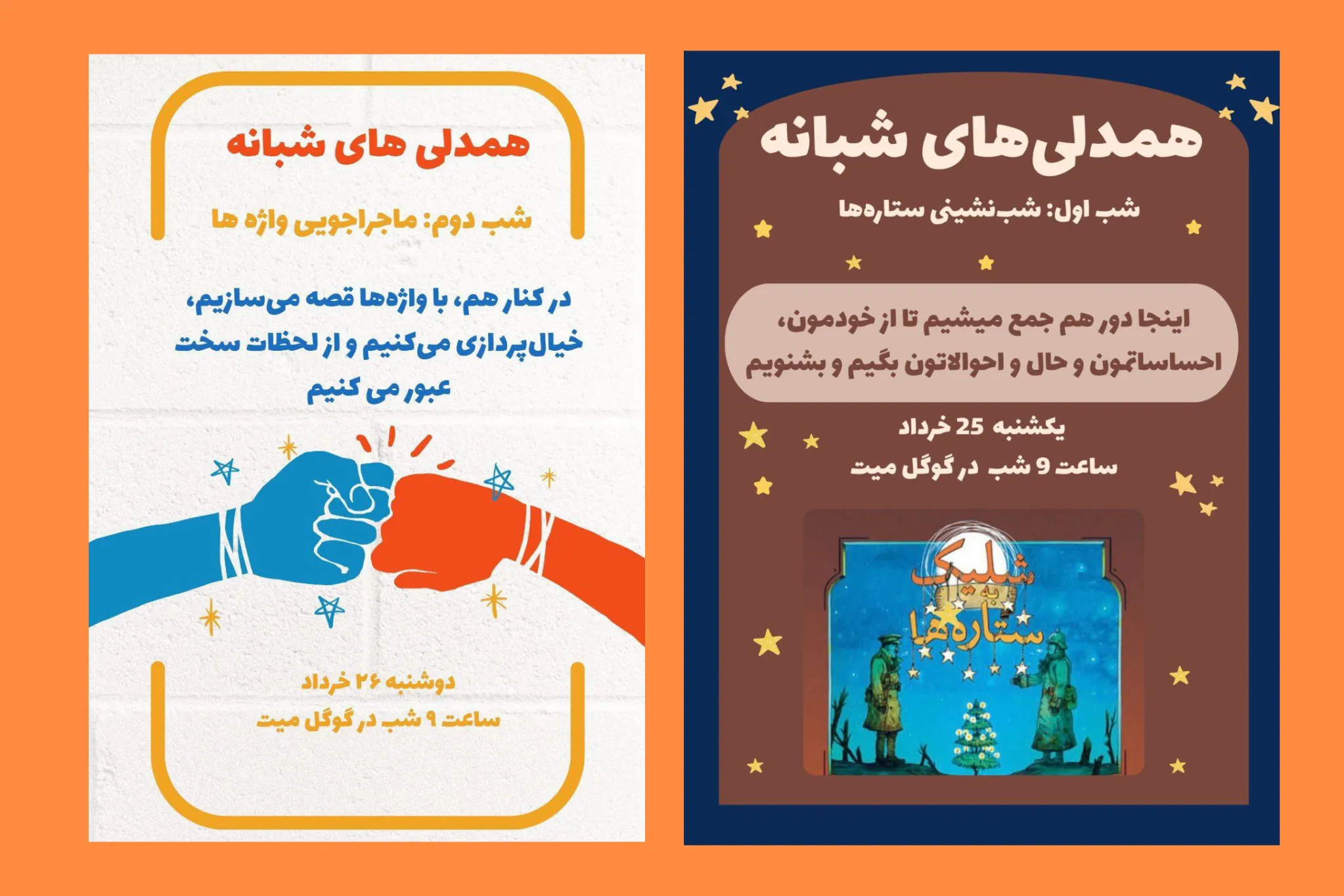 برنامه این بود که بعد از خواندن کتاب، با هم نقاشی بکشیم. هر کس، ستارهی خودش را بکشد. برای آن اسم بگذارد و ستاره محافظش را نشانمان بدهد اما نشد و چرا؟ دیدیم بچه ها بیشتر دلشان میخواهد صحبت کنند، از حال و هوای خودشان بگویند و موقعیت سایر افراد در چنین شرایطی مشاهدهگر باشند. ما نیز با جریان همراه شدیم. قطعا برای ما، حس و حال اعضای بهمان مهمتر بود. این جلسه، دو ساعت طول کشید و در پایان گفت و گوها، همه چیز اتفاق افتاد. از فرط ناامیدی تا امیدی پنهان در قلب ها گفتیم، از بغض هایی که در صداها نفهته بود و هزاران احساس متفاوت و شاید متناقض صحبت کردیم. مهم آن بود که هرکس هرچه داشت، ابراز کرد. معیاری برای پذیرش یا ابراز گفته ها نبود. تنها این مهم بود که هرکس، تجربههای زیسته خودش در این دوران را با خود بیاورد.